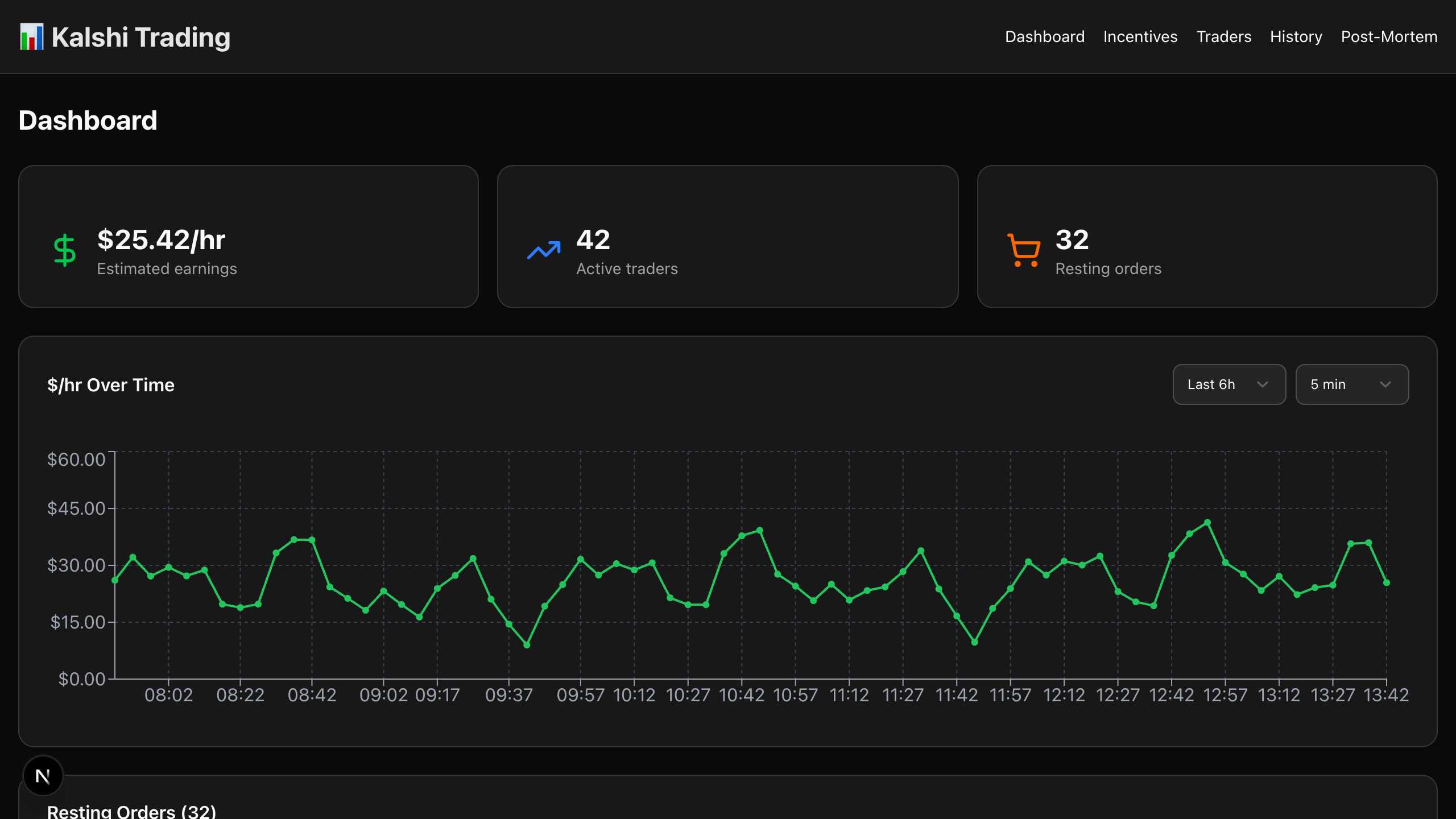 - Built a Next.js dashboard showing trader groups by event, real-time order state, buffer %, queue position, incentive lifecycle, and rate history charts.